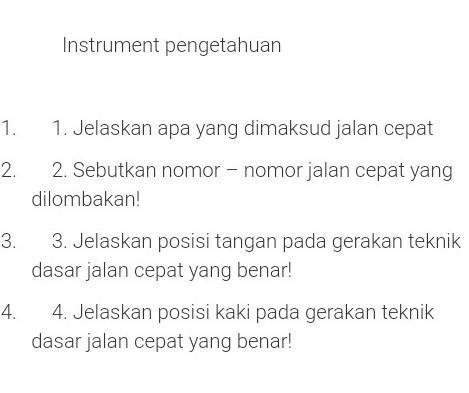 Jalan cepat atau disebut dengan brisk walking masuk dalam cabang olahraga atletik. Berikut adalah soal mata pelajaran pjok kelas xi sma materi atletik nomor jalan. Ringkasan buku sekolah kelas 8 (smp/mts) pjok bab x. Soal tentang jalan cepat beserta jawabannya kurikulum 2013 revisi terbaru soal jalan cepat smp mts. Mengutip dari kamus besar bahasa indonesia (kbbi) jalan cepat yakni nomor olahraga atletik, dengan cara melangkah .